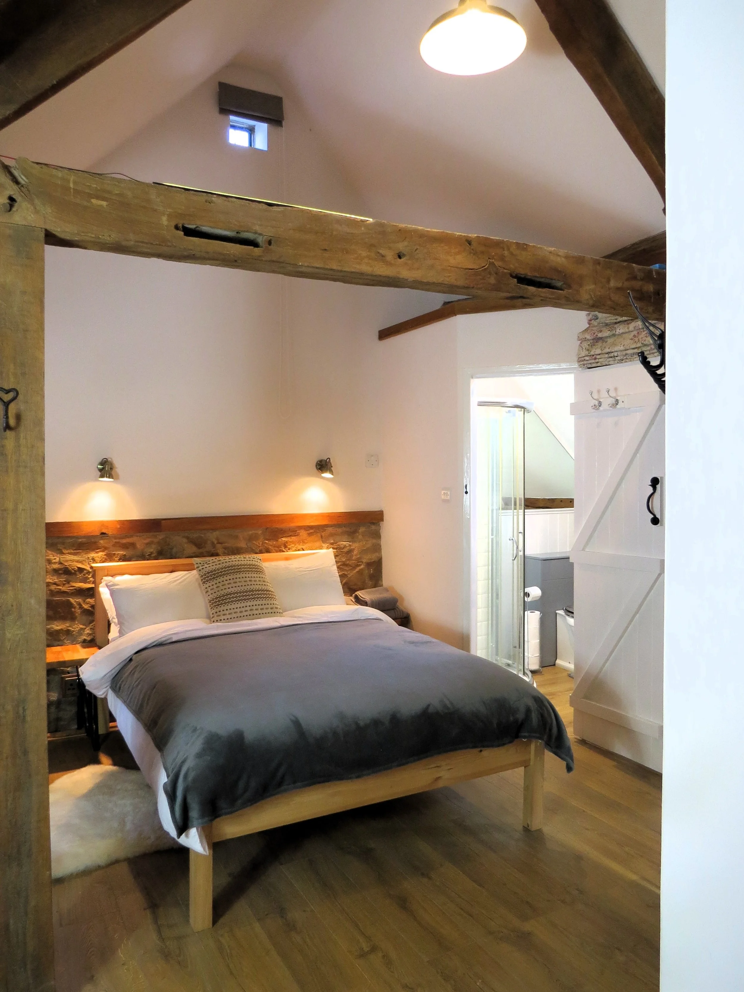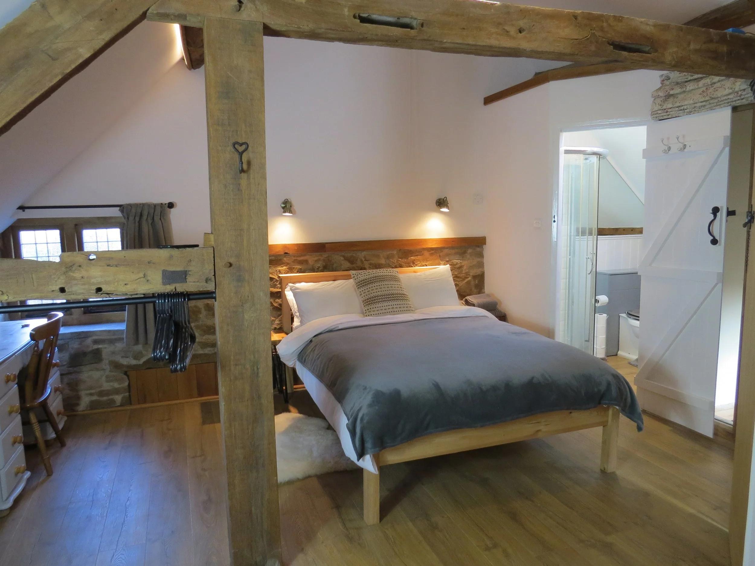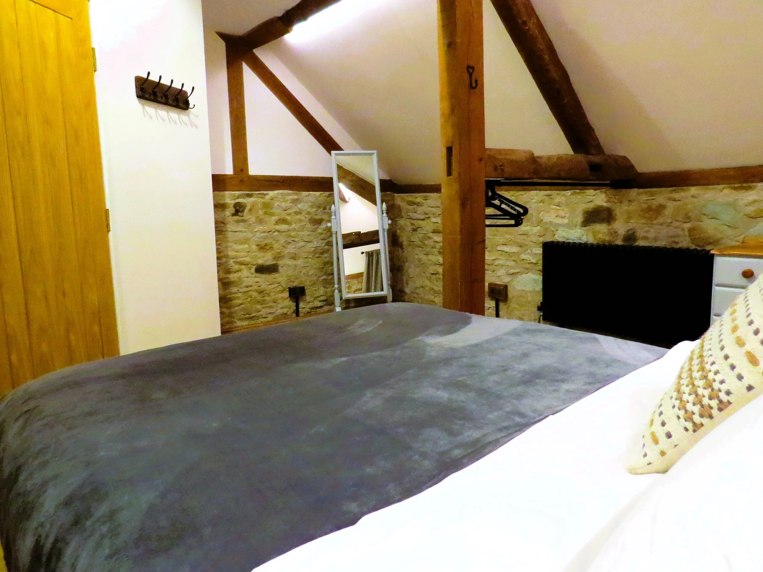 Bedroom one has stunningly restored stone walls with an ensuite bathroom. The bathroom is equipped with a shower, toilet, sink and a welcome supply of soaps and toilet roll. The Bedroom itself has one standard double bed, desk and chair, full length mirror and hanging rail.