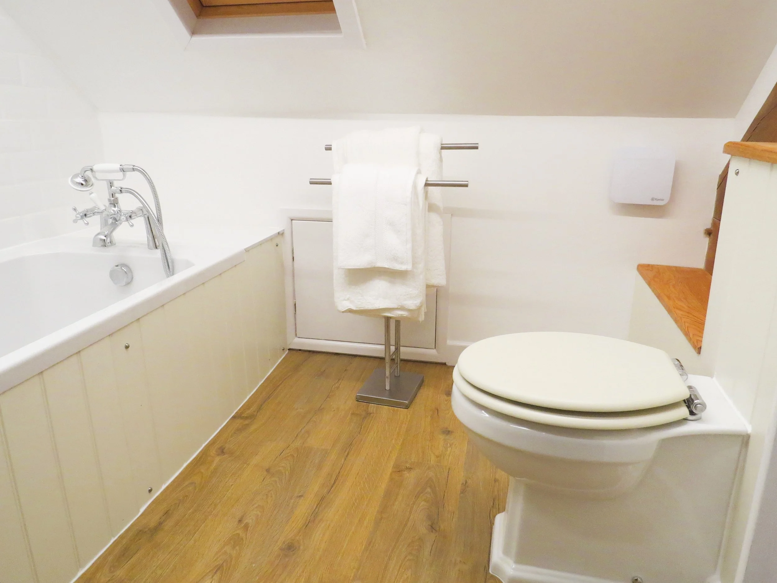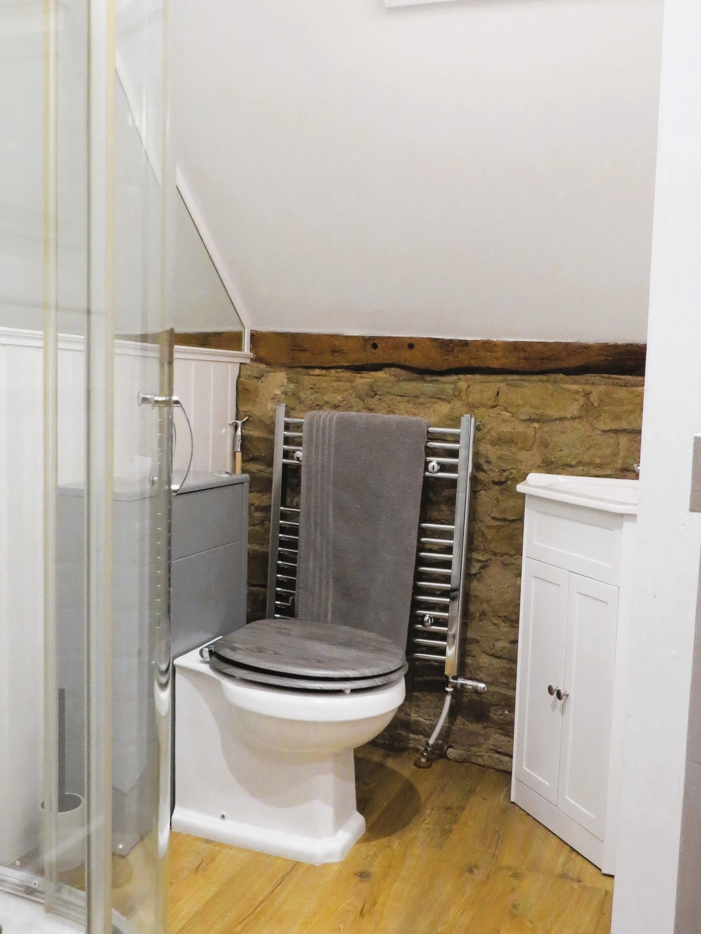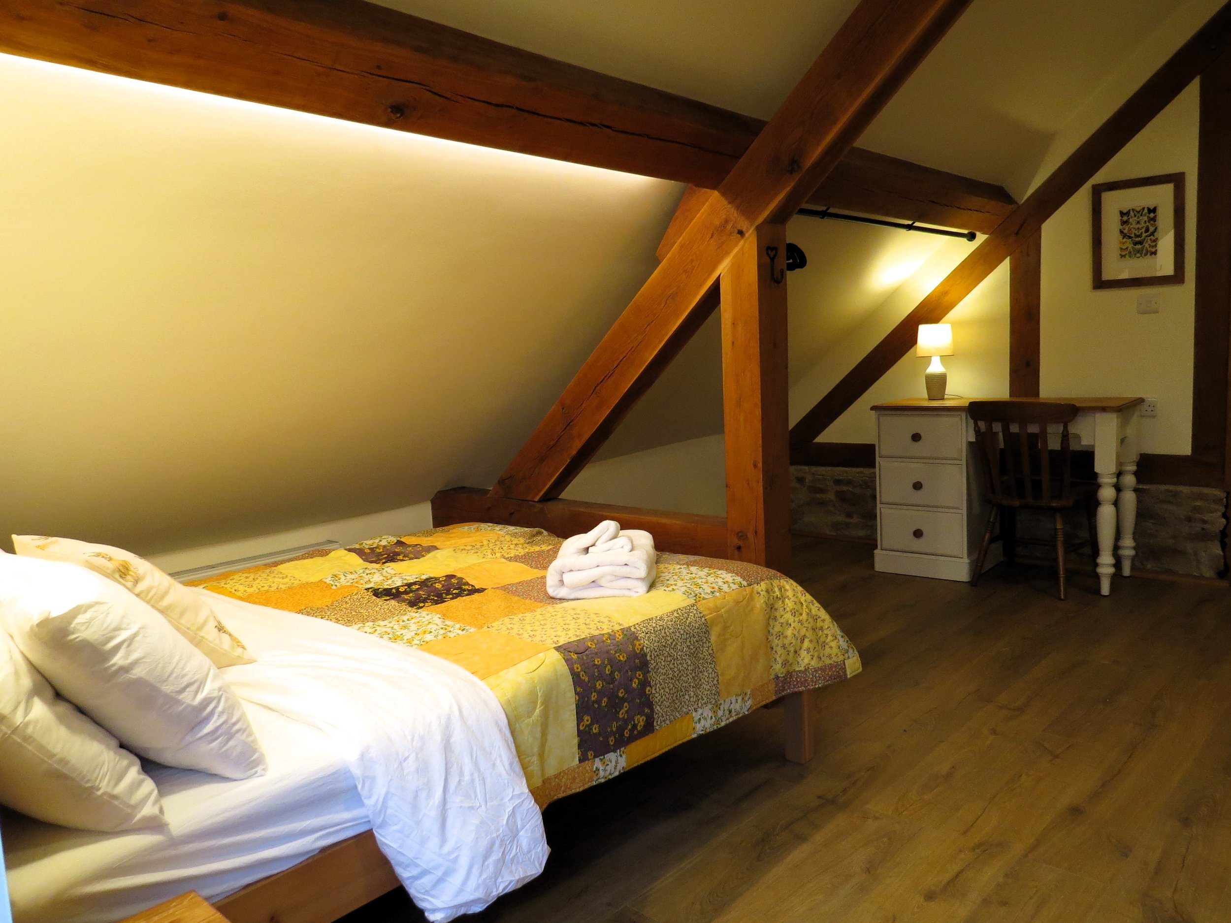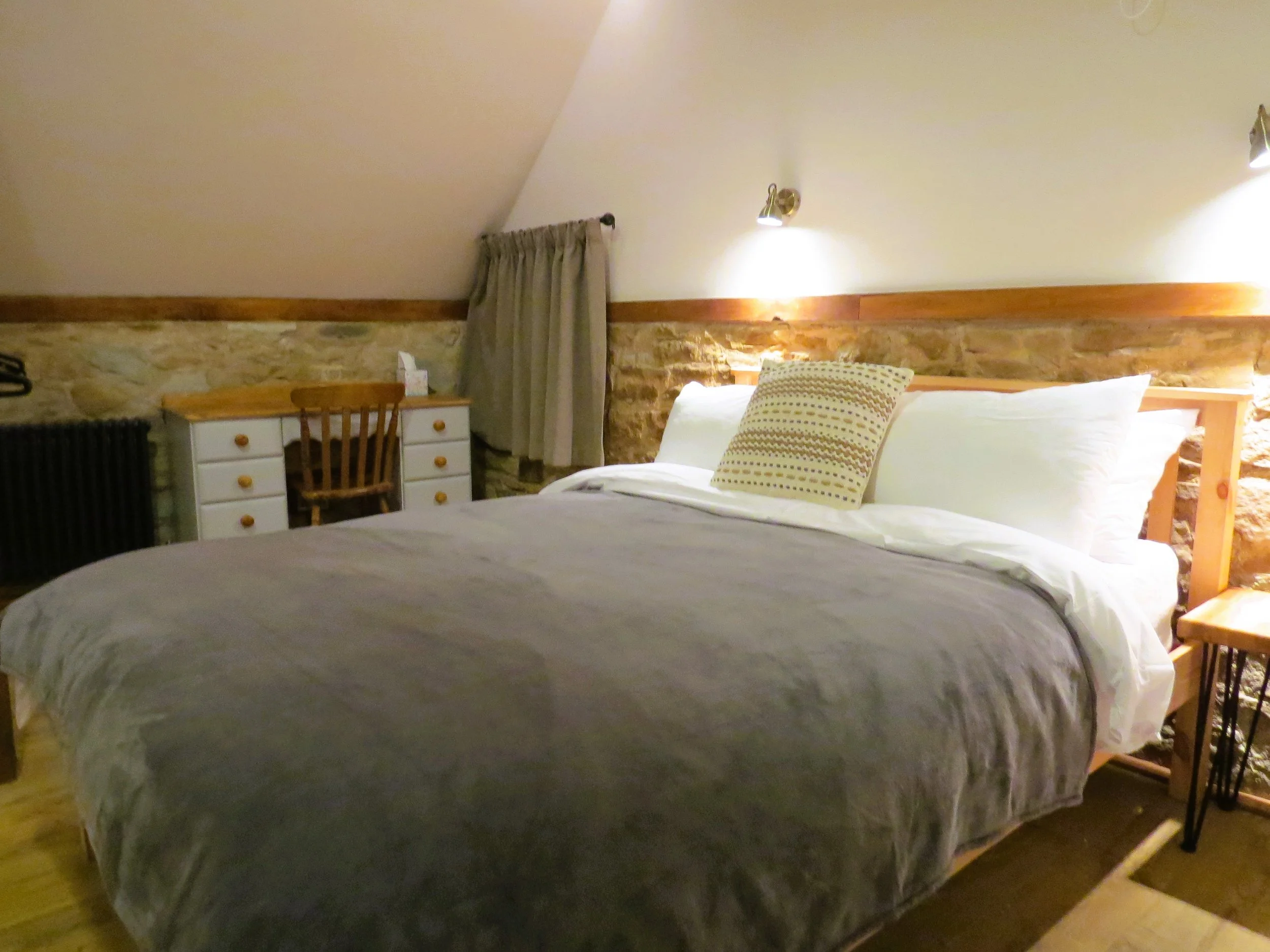 Bedroom one has stunningly restored stone walls with an ensuite bathroom. The bathroom is equipped with a shower, toilet, sink and a welcome supply of soaps and toilet roll. The Bedroom itself has one standard double bed, desk and chair, full length mirror and hanging rail.