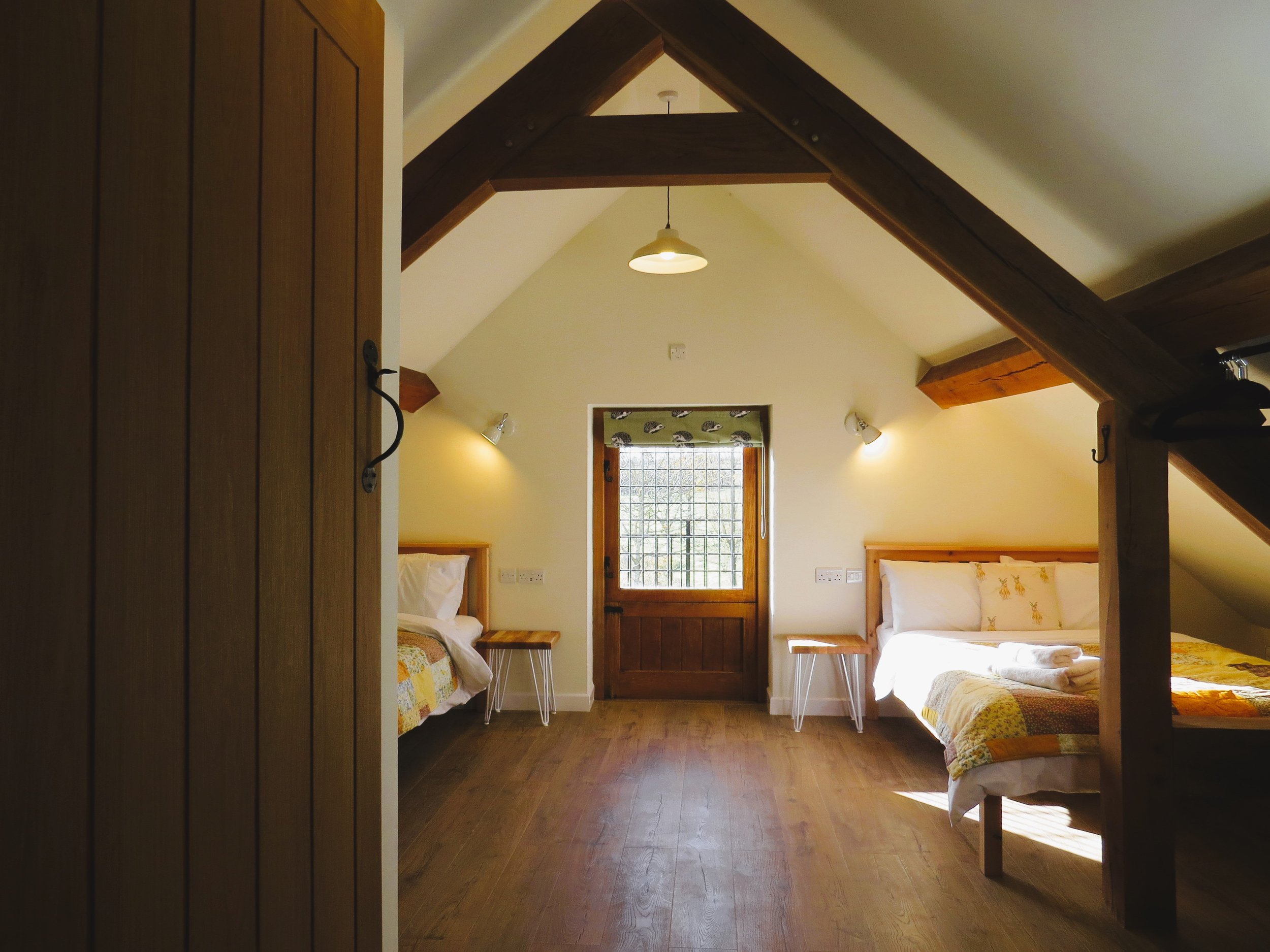 Bedroom two has 2 standard double beds with an ensuite containing a bath, shower, toilet and sink. The room opens out onto a small balcony that overlooks beautiful fields.